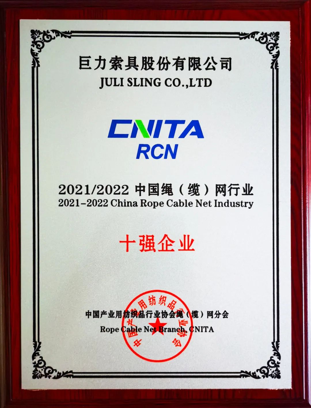 巨力索具榮獲“2021/2022中國(guó)繩(纜)網(wǎng)行業(yè)十強(qiáng)企業(yè)”