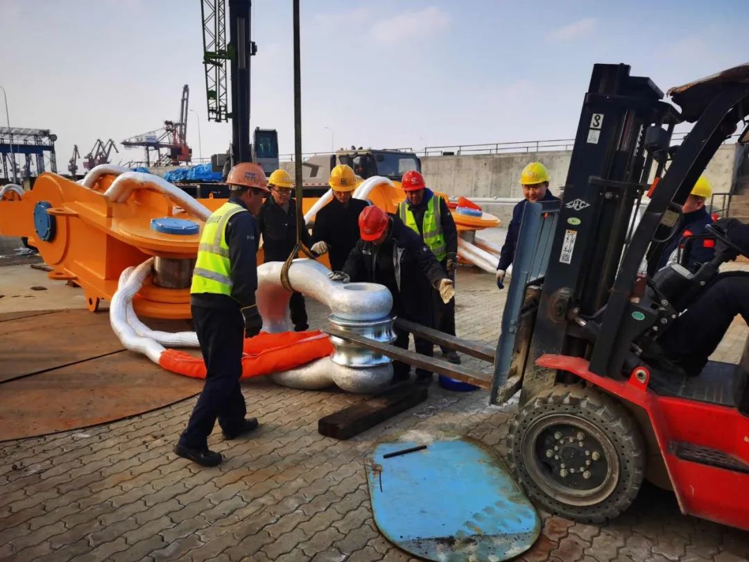 為確保防撞鋼套箱的順利吊裝,巨力索具項目團隊積極與青龍門大橋項目部對接交流,提供吊梁、卸扣、高強環形吊索等2400T鋼套箱吊具,克服作業環境帶來的難題,從專業角度配合完成吊裝。