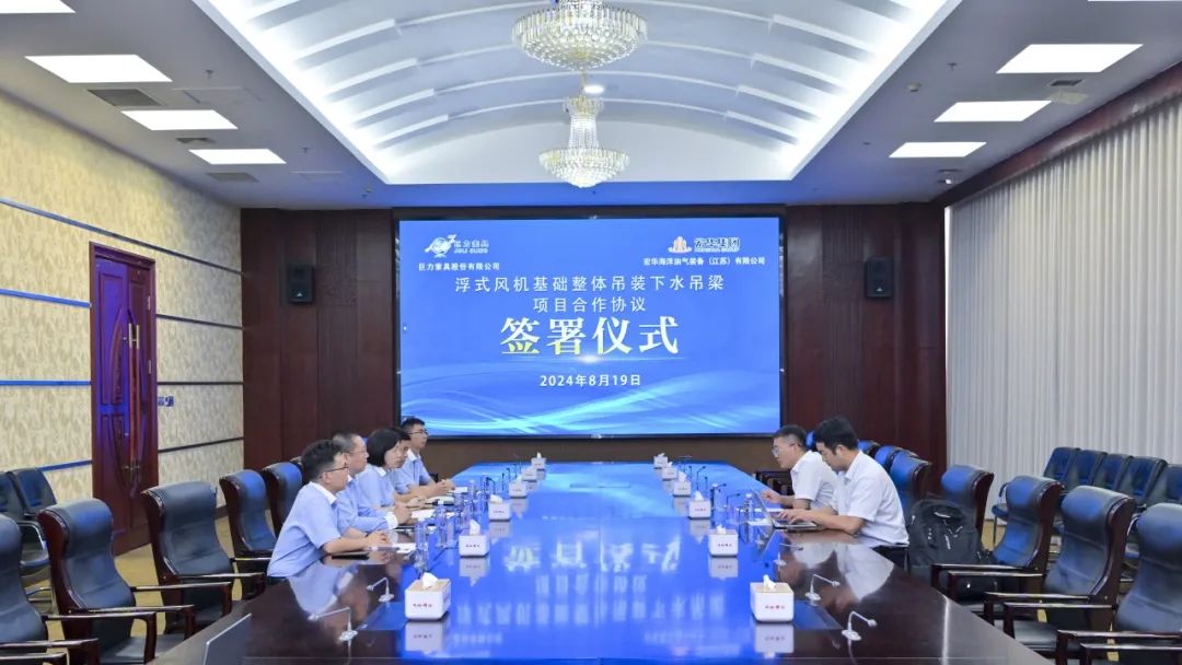 8月19日,巨力索具與宏華海洋油氣裝備(江蘇)有限公司(以下簡稱宏華海洋)就“浮式風(fēng)機基礎(chǔ)整體吊裝下水吊梁”簽署項目合作協(xié)議。巨力索具常務(wù)副總裁李彥英、宏華海洋副總經(jīng)理呂巖分別代表雙方簽署協(xié)議。巨力索具副總裁張海波、宏華海洋技術(shù)副部長李博參加會議。