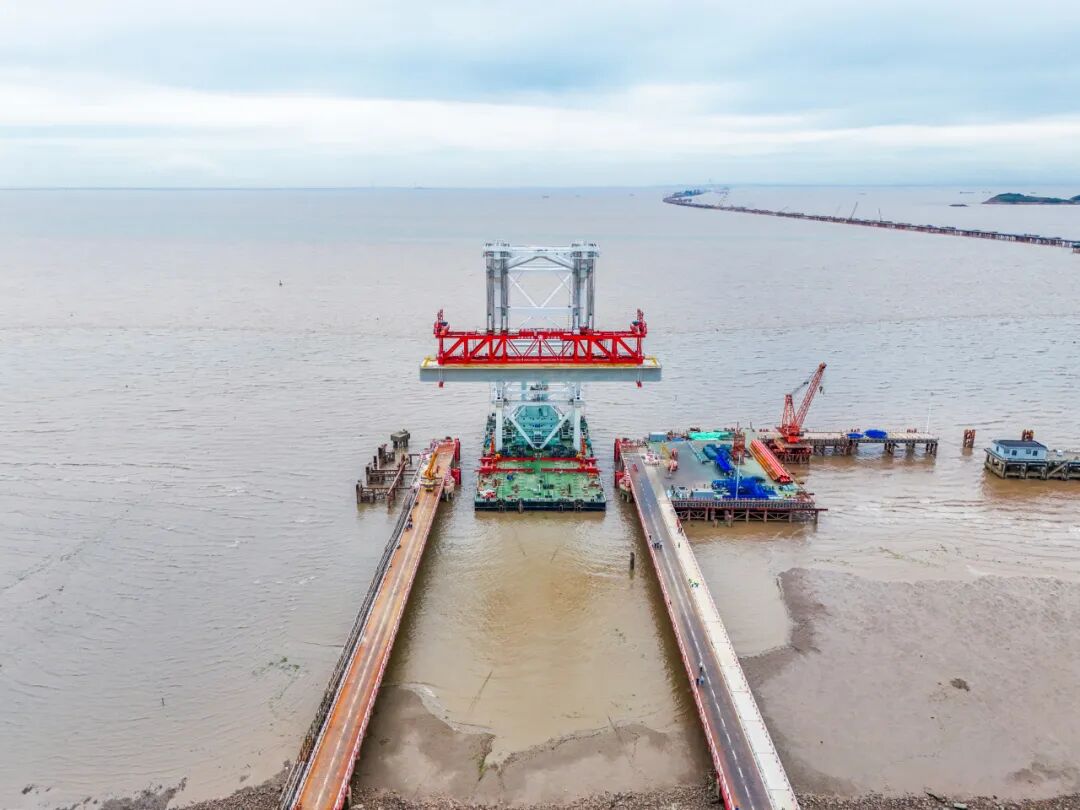 巨力索具生產(chǎn)制造的預(yù)制箱梁吊具與中鐵大橋局研制的“天一號(hào)”運(yùn)架一體船協(xié)同作戰(zhàn),采用“低平潮取梁、漲潮期運(yùn)輸、平潮期落梁”的精準(zhǔn)調(diào)度方案,克服了海域潮汐變化大、海上風(fēng)浪干擾強(qiáng)、運(yùn)輸距離長(zhǎng)等諸多施工難題,將落梁誤差控制在毫米級(jí),最終將這新一代“世界梁王”架設(shè)到位。