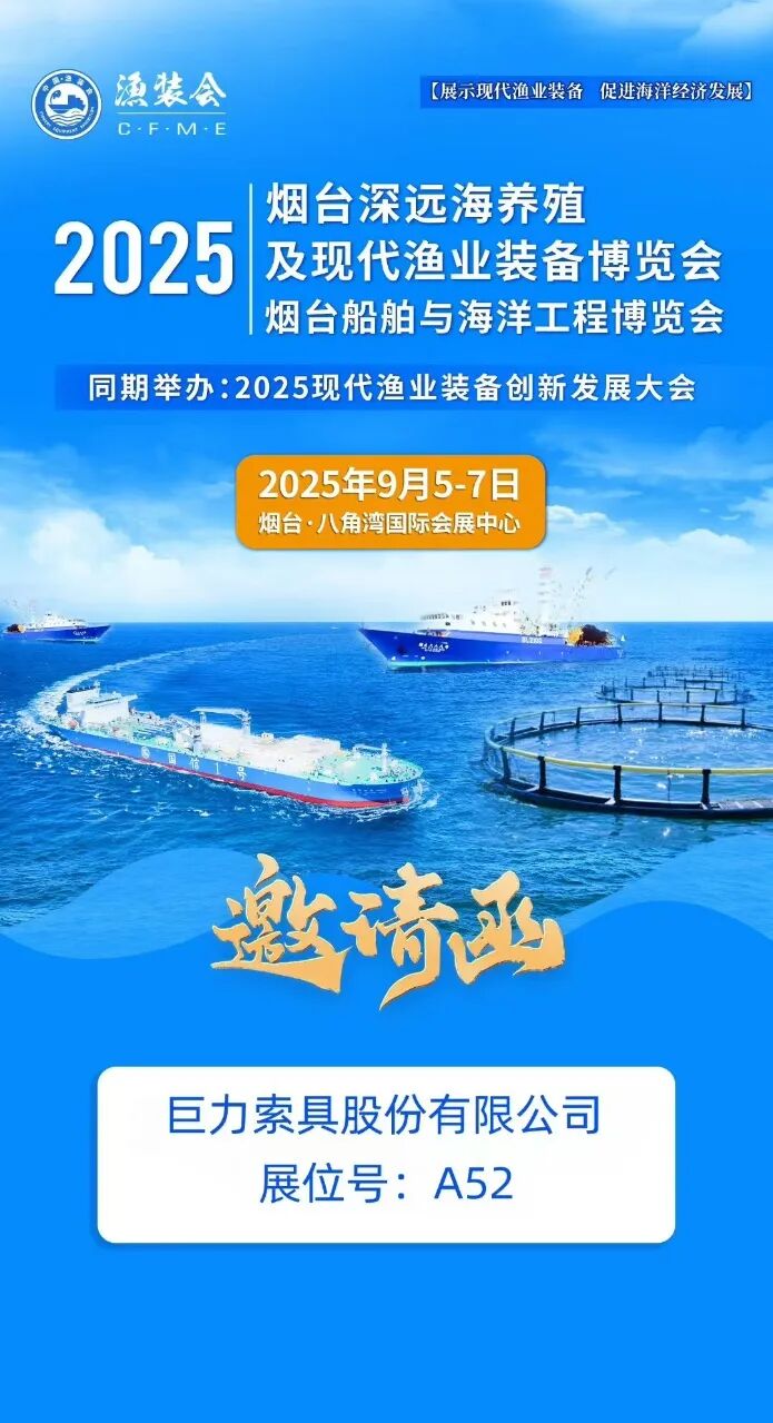 作為索具行業(yè)的領(lǐng)軍企業(yè),巨力索具將亮相本屆展會(huì),誠(chéng)邀業(yè)界同仁、合作伙伴與廣大客戶蒞臨展位,共同探討深遠(yuǎn)海養(yǎng)殖與海洋裝備的前沿技術(shù)與發(fā)展趨勢(shì),攜手邁向海洋經(jīng)濟(jì)新藍(lán)海。