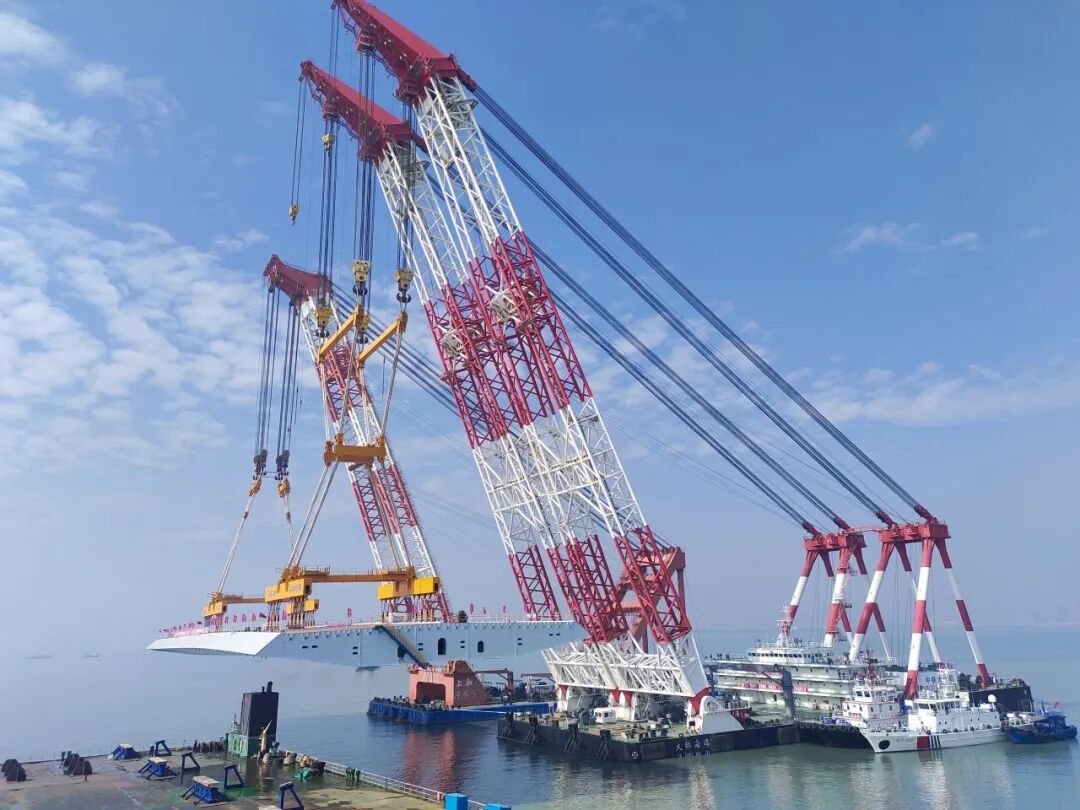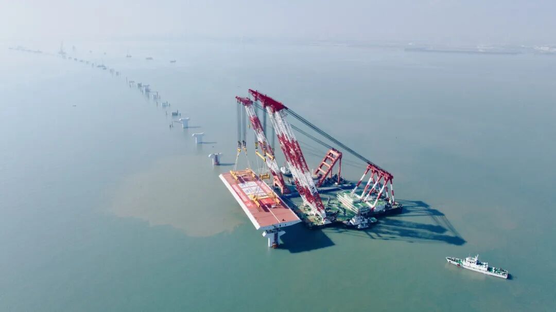 廈金大橋(廈門段)總長約19.6公里,本次吊裝的鋼箱梁位于大嶝西航道橋東側(cè)的90-91號墩,梁長142.5米、寬44米、高4.5米,總重量4586噸,堪稱“海上巨無霸”。該梁段的成功架設(shè),刷新了海上裝配式橋梁整孔架設(shè)鋼梁的重量記錄,也為行業(yè)內(nèi)淺灘海域“智能裝配化”造橋提供了重要實(shí)踐。
