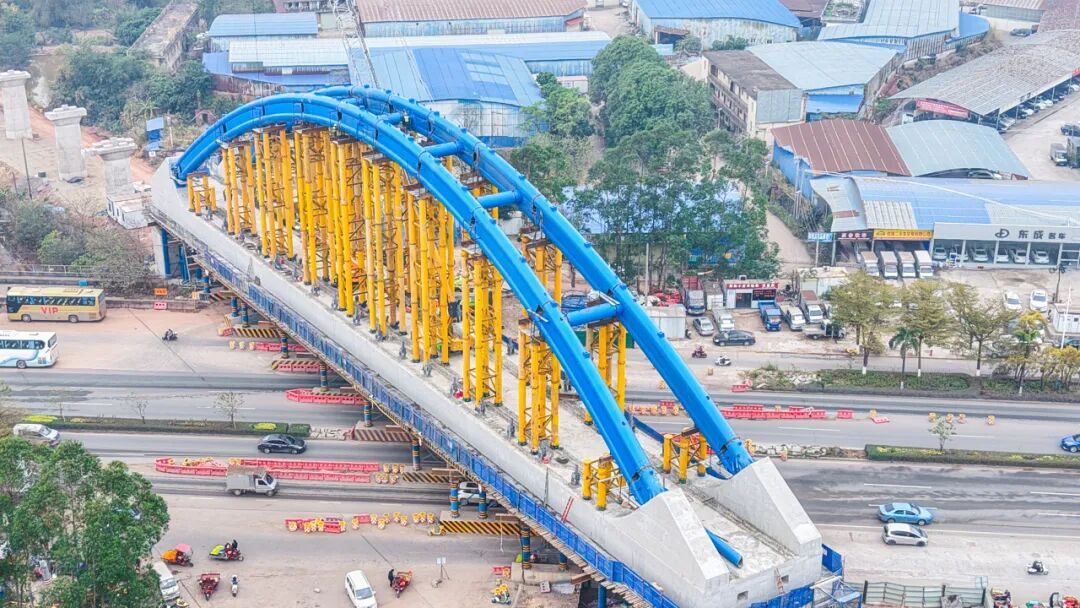 該項(xiàng)目位于廣西欽州市欽北區(qū),線路全長4.138公里,其中長達(dá)3.293公里的特大橋——跨欽州灣大道鋼管拱橋,是全線的控制性工程。