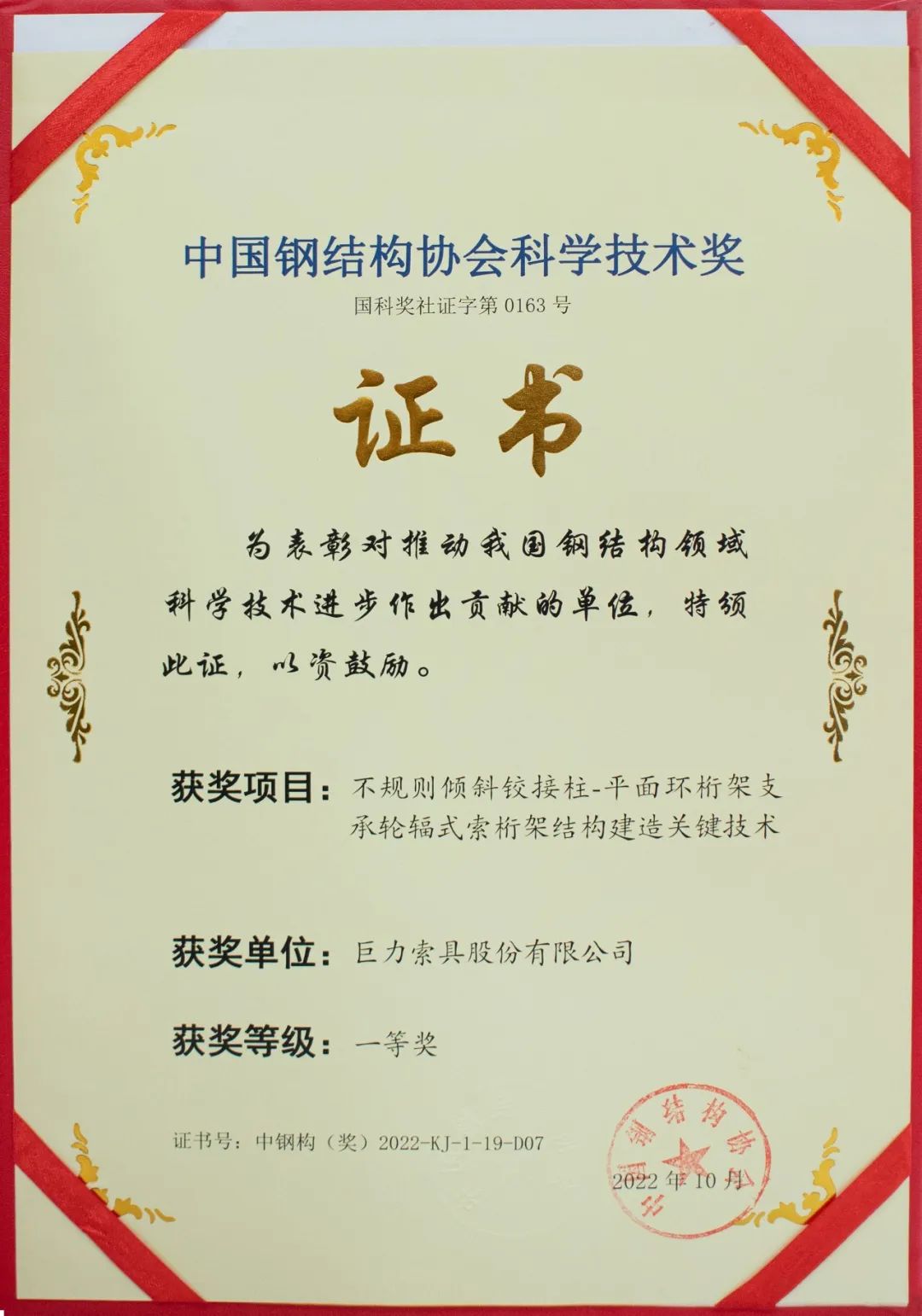 巨力索具斬獲“中國鋼結構協會科學技術獎”一等獎!