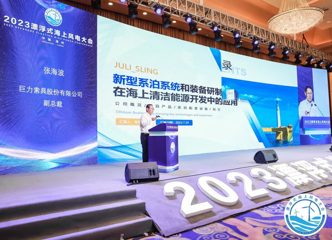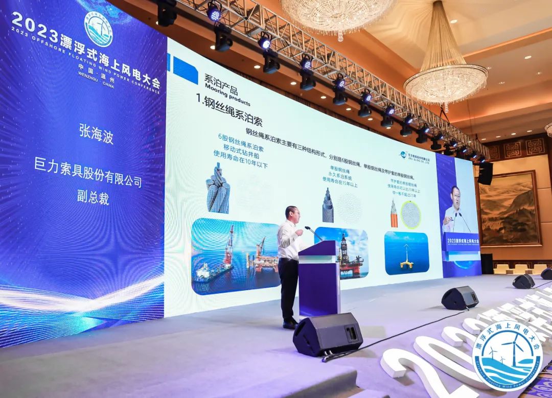 2023年7月28日-29日,溫州市人民政府聯(lián)合中國海洋工程咨詢協(xié)會海上風(fēng)電分會、國家風(fēng)力發(fā)電工程技術(shù)研究中心等風(fēng)電重點企事業(yè)單位舉辦的“2023年漂浮式海上風(fēng)電大會”順利召開。巨力索具副總裁張海波出席會議并做報告。